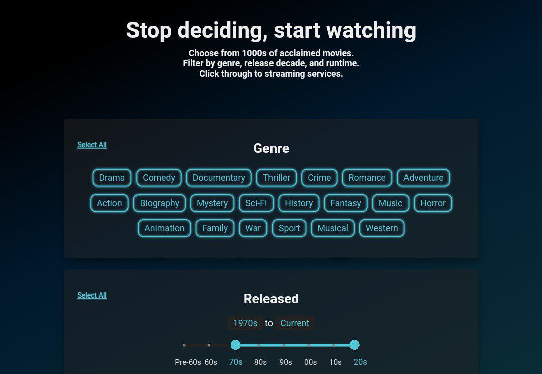 این سایت برخلاف لیست‌های آماده یا پیشنهادهای کلی شبکه‌های استریم، کاملاً شخصی‌سازی‌شده عمل می‌کند؛ یعنی شما انتخاب می‌کنید چه نوع فیلمی می‌خواهید و سایت با چند کلیک بهترین گزینه‌ها را تحویل می‌دهد.